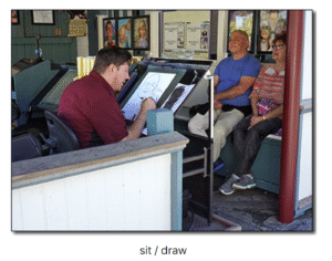 Trong hình, ngồi và vẽ là 2 hành động đang xảy ra đồng thời